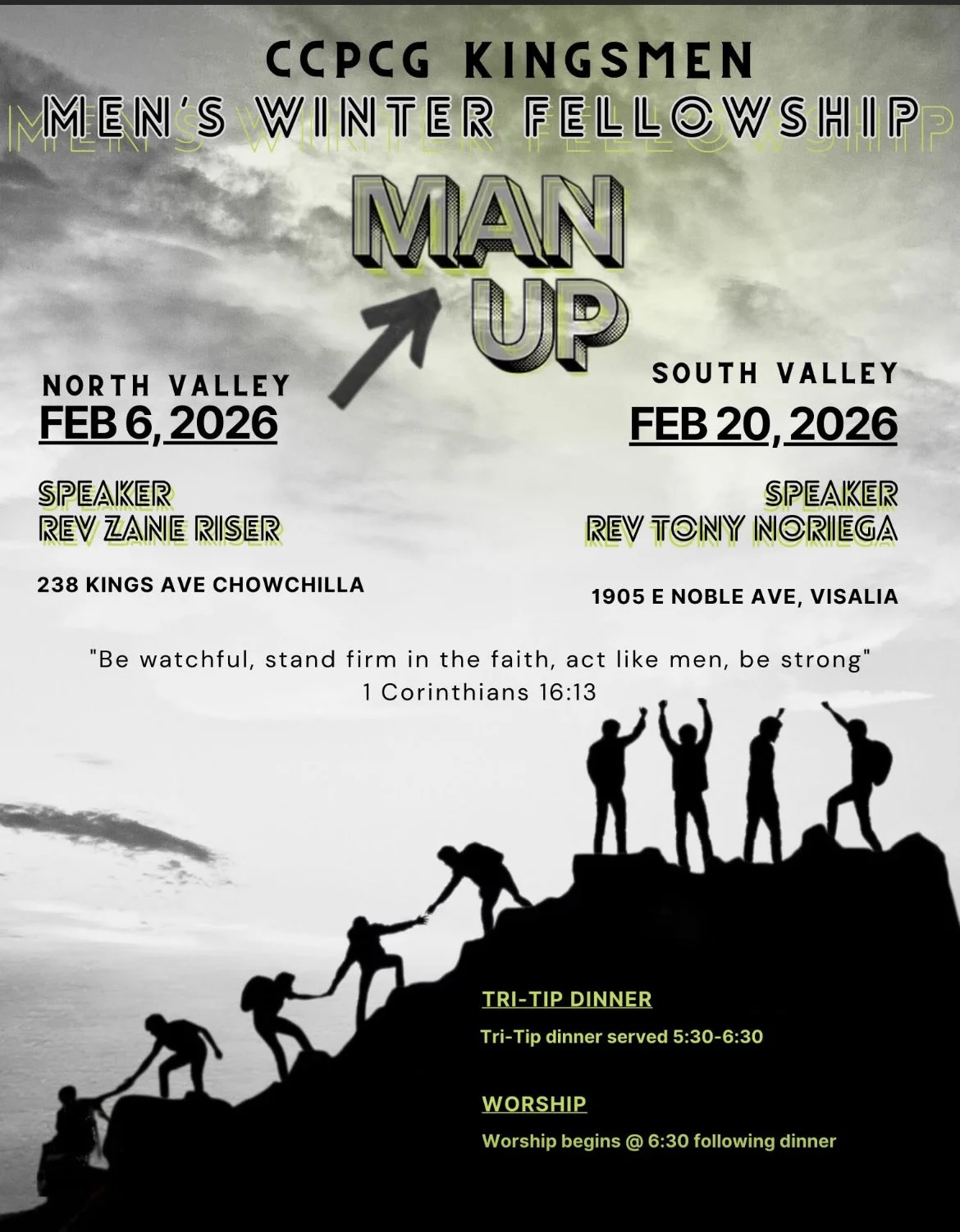 Friday February 20th @5:30pm/6:30pm Men’s Dinner and Church Service.